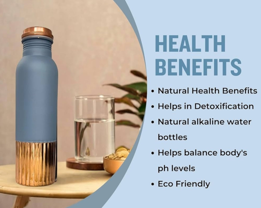 Experience the benefits of a two tone copper water bottle with its elegant shimmer and unique color. Its copper composition provides antimicrobial properties and helps regulate water's pH levels for a healthier hydration. Stay hydrated in style with this functional and beautiful water bottle.